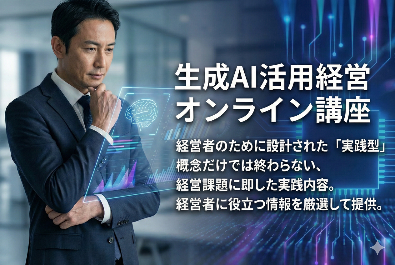 生成AIに興味はあるが「情報が多すぎて分からない」「経営にどう使えばいいのか見えない」——そんな経営者のための実践型オンライン講座です。