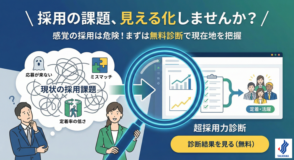 この診断では、「採用人数の決め方」「責任の所在」「判断基準の有無」など、経営者しか答えられない質問から組織の採用力を診断します。